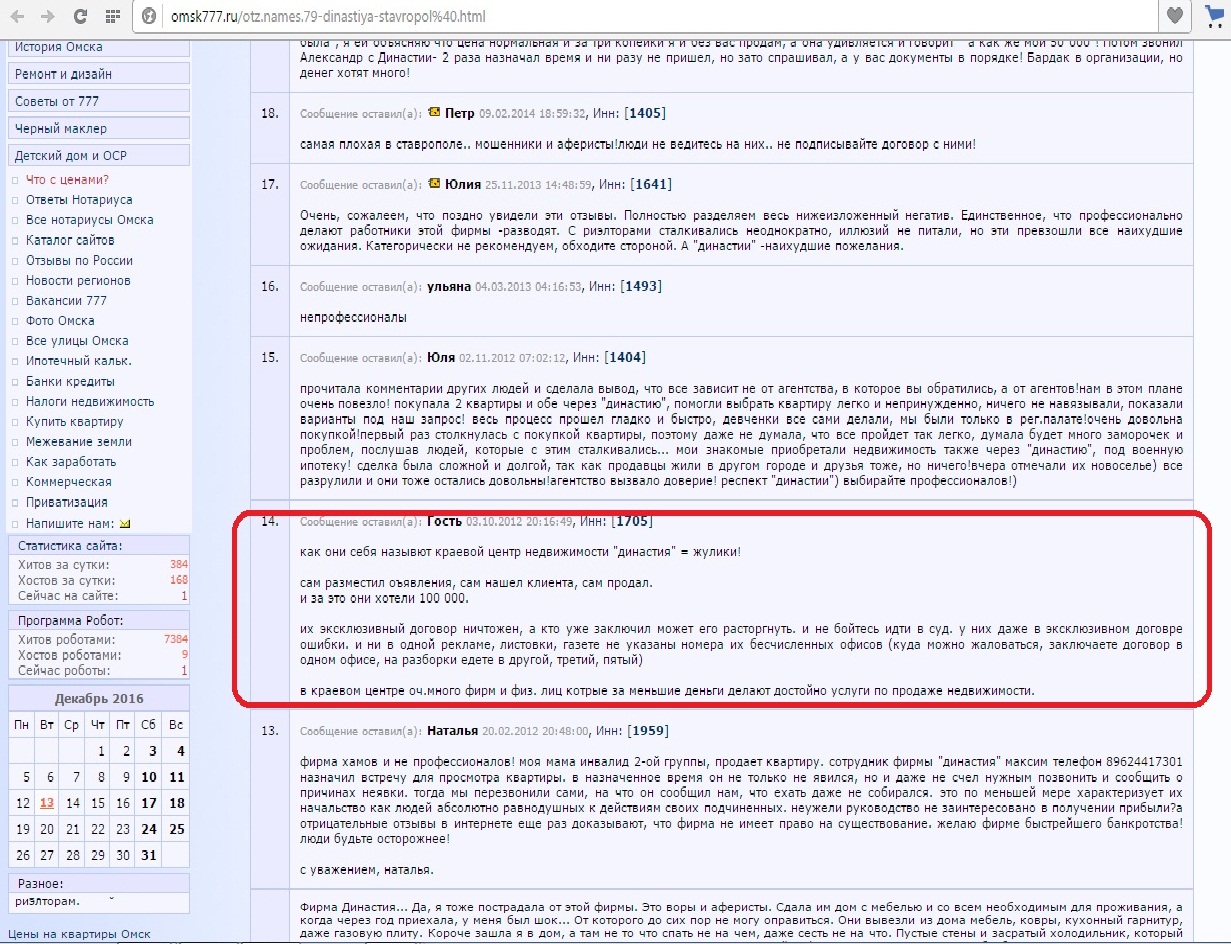 Вот честно: читаю отзывы о «Династии», и я просто в шоке! Искала отзывы о компании и, поразительное дело, на нескольких сайтах комменты прям слово в слово. Прям вот складывается впечатление, что кто-то ОЧЕНЬ не любит «Династию», и, как мне кажется, отнюдь не за какой бы то ни было «печальный опыт» от работы с их специалистами. Просто по-человески не приятно. Может, я и ошибаюсь, но выглядит все так, будто один человек сидит и занимается добавлением этих комментов. Не знаю, может кому-то платят за подобное поливание грязью, может какие-то личные счеты, может бывшие сотрудники, может конкуренты... Но это же ужасно, разве нет, ЛЮДИ?! Больше похоже на антипиар в сторону компании, чем на реальные отзывы. Если есть реальные жалобы, почему бы просто не разобраться с компанией? У них же есть юристы, как ни как, агентство недвижимости. Вот просто подумайте, что эти комменты рушат репутацию компании, а там работают такие же ЛЮДИ, как и Вы. У них тоже есть семьи, которые от них зависят, а подобные комменты людей пугают и лишают агентов работы. Я не спорю, даже в каждой шутке есть доля правды, вполне уверена, что есть люди, у которых и правда могло что-то не так пройти по сделке, но, уж простите, я не верю, НЕ ВЕРЮ, что они прям всей компанией будут заходить на все сайты и вести свой одинаковый недовольно-обиженный диалог. Это не -ре-аль-но!!! Просто по-человечески, мне горько, что люди не думают о других!!! Слово — не воробей, а репутация компании — дело хрупкое. Давайте же будем добрее!!! И, к слову, лично я работала с «Династией», осталась довольна. Даю 100% гарантию, что я простой живой реальный человек и даже не риэлтор. Простите за многословность, НАКИПЕЛО :D Тоскую по временам, когда люди знали, что такое справедливость, доброта, участливость. Сейчас же миром правит выгода, а ложь и клевета ради выгоды уже никого не смущает.